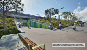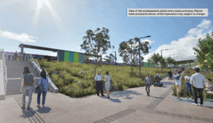 - Beautiful landscaping featuring 17,000+ native trees, plants, shrubs and grasses – from wattles and bottlebrushes to flowering gums and local grasses. Bright green tiling in the underpass and splashes of green tones throughout the precinct balance function with aesthetics.